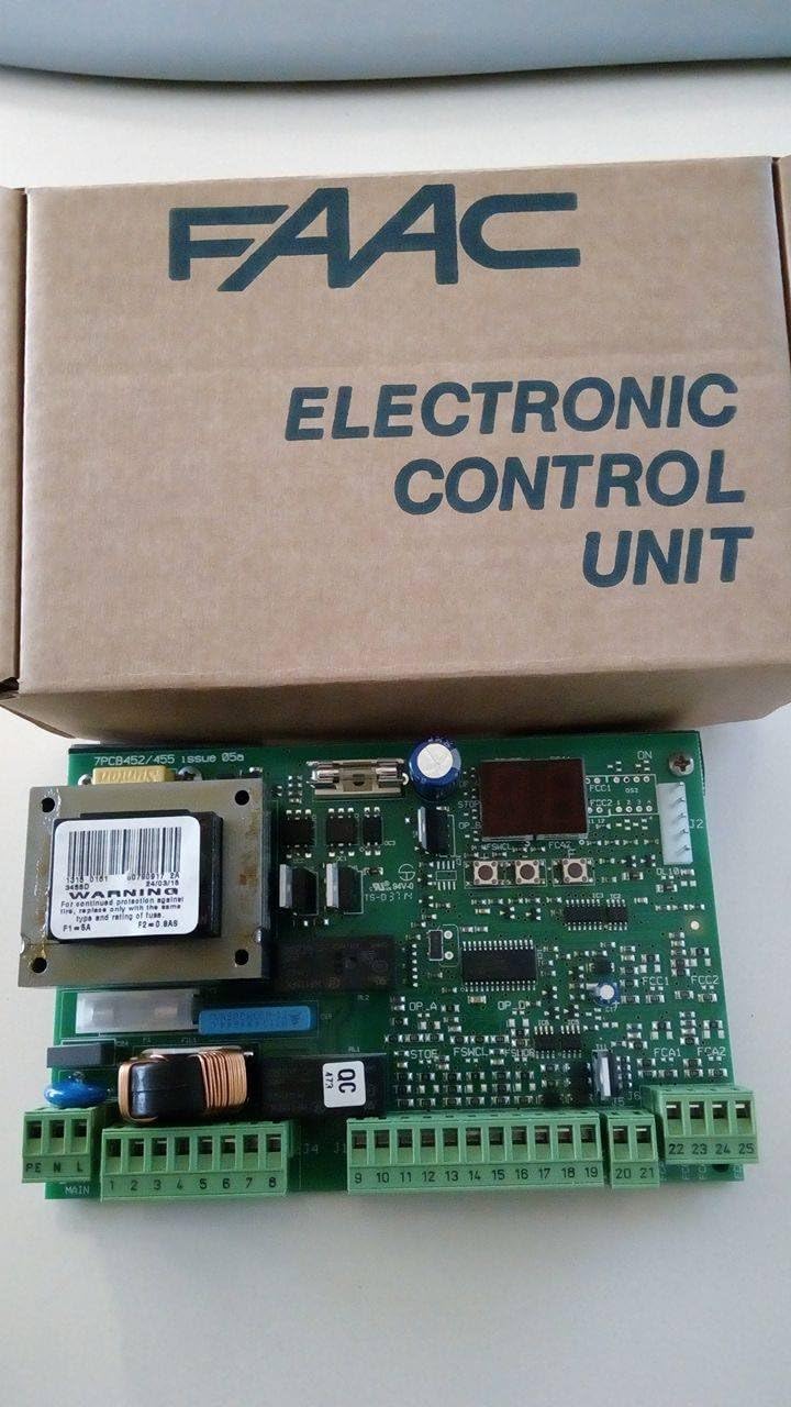 The FAAC 455D (Model 790917) is a robust electronic control board designed for managing automated gate systems. It features clearly labeled terminal blocks for power input, motor connections, and accessory inputs.