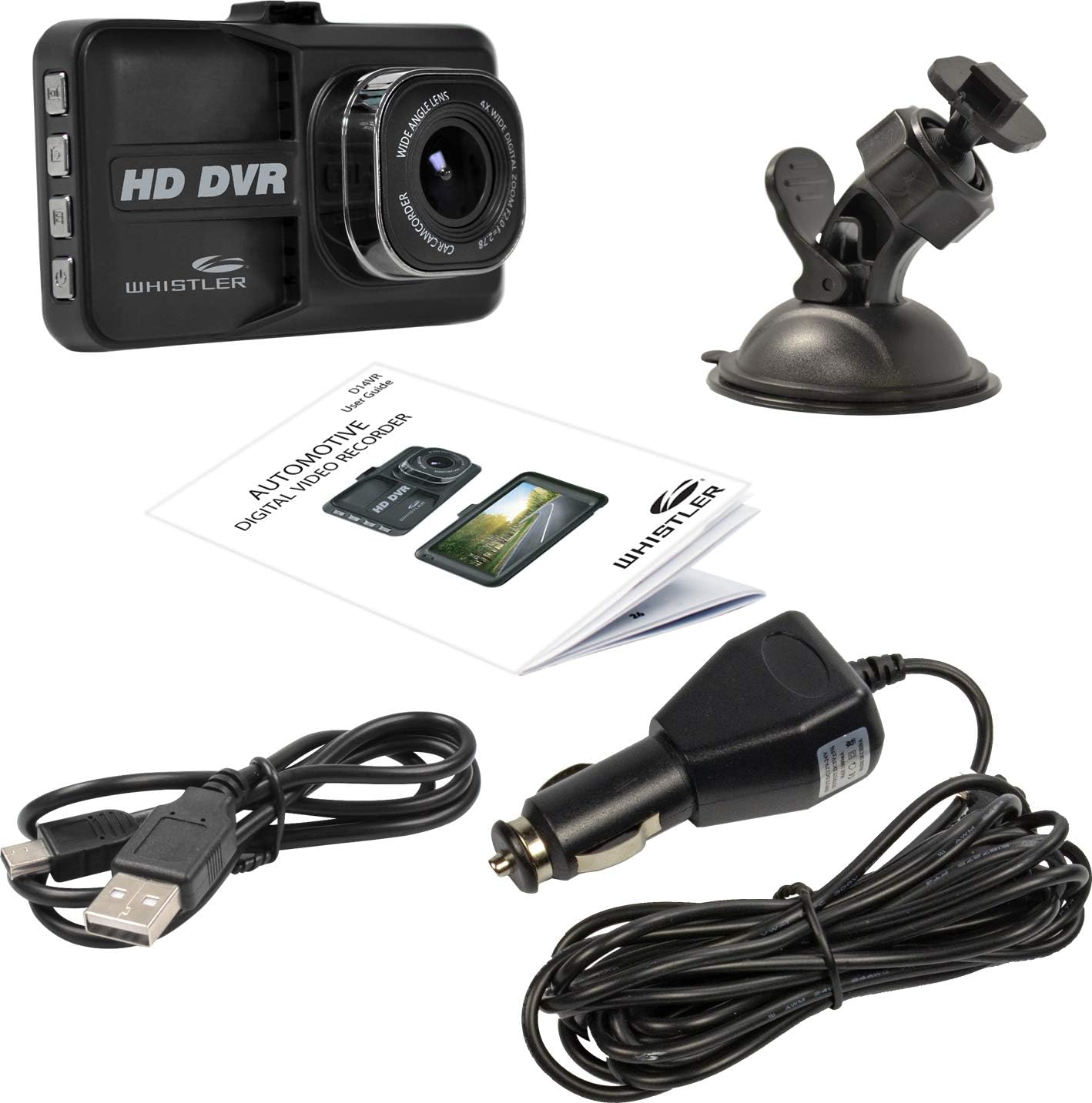 Image: The Whistler D14VR Dash Camera, suction cup mount, car charger, USB cable, and user guide.