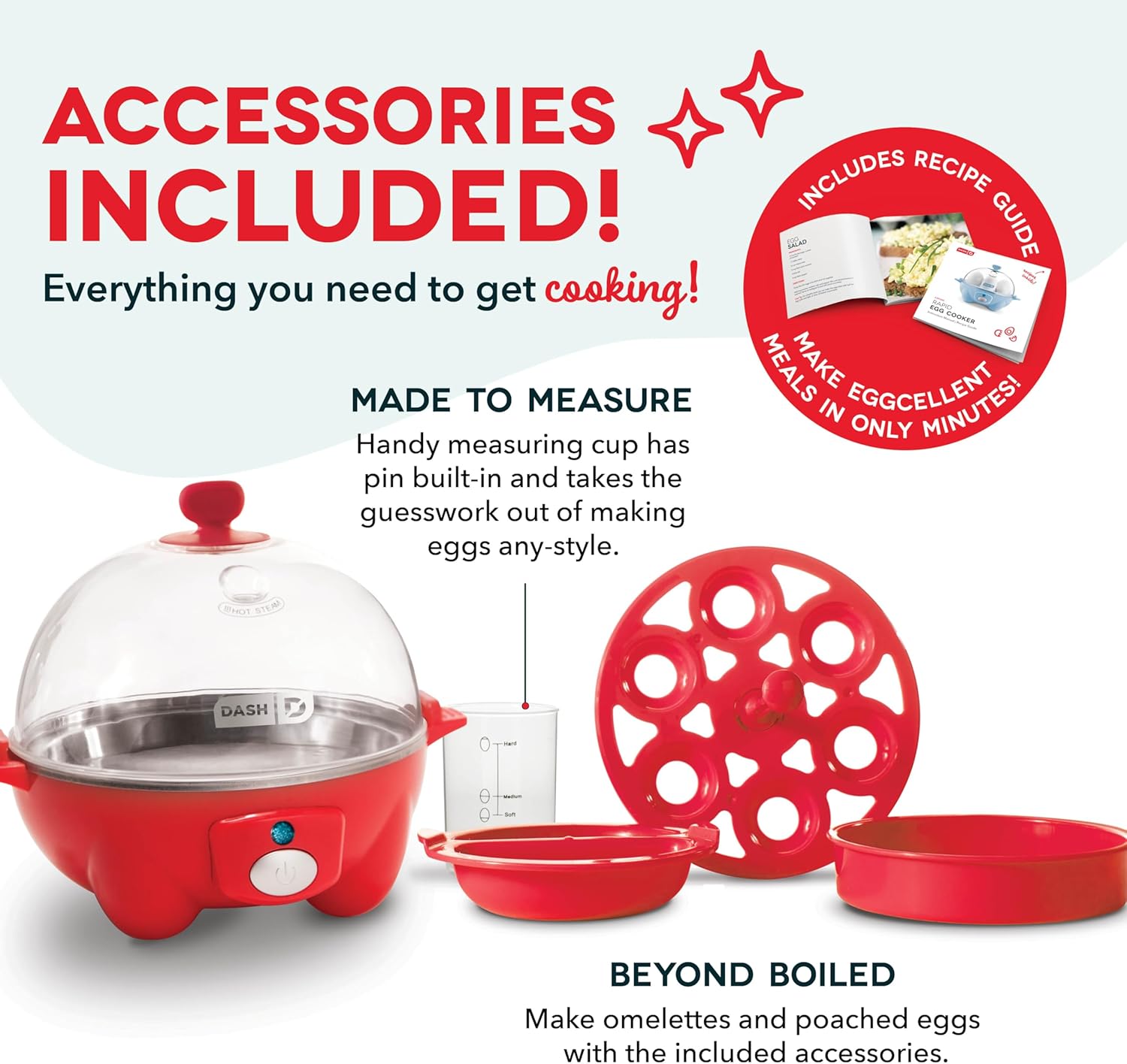 The DASH Rapid Egg Cooker comes with all the necessary accessories to get you started: