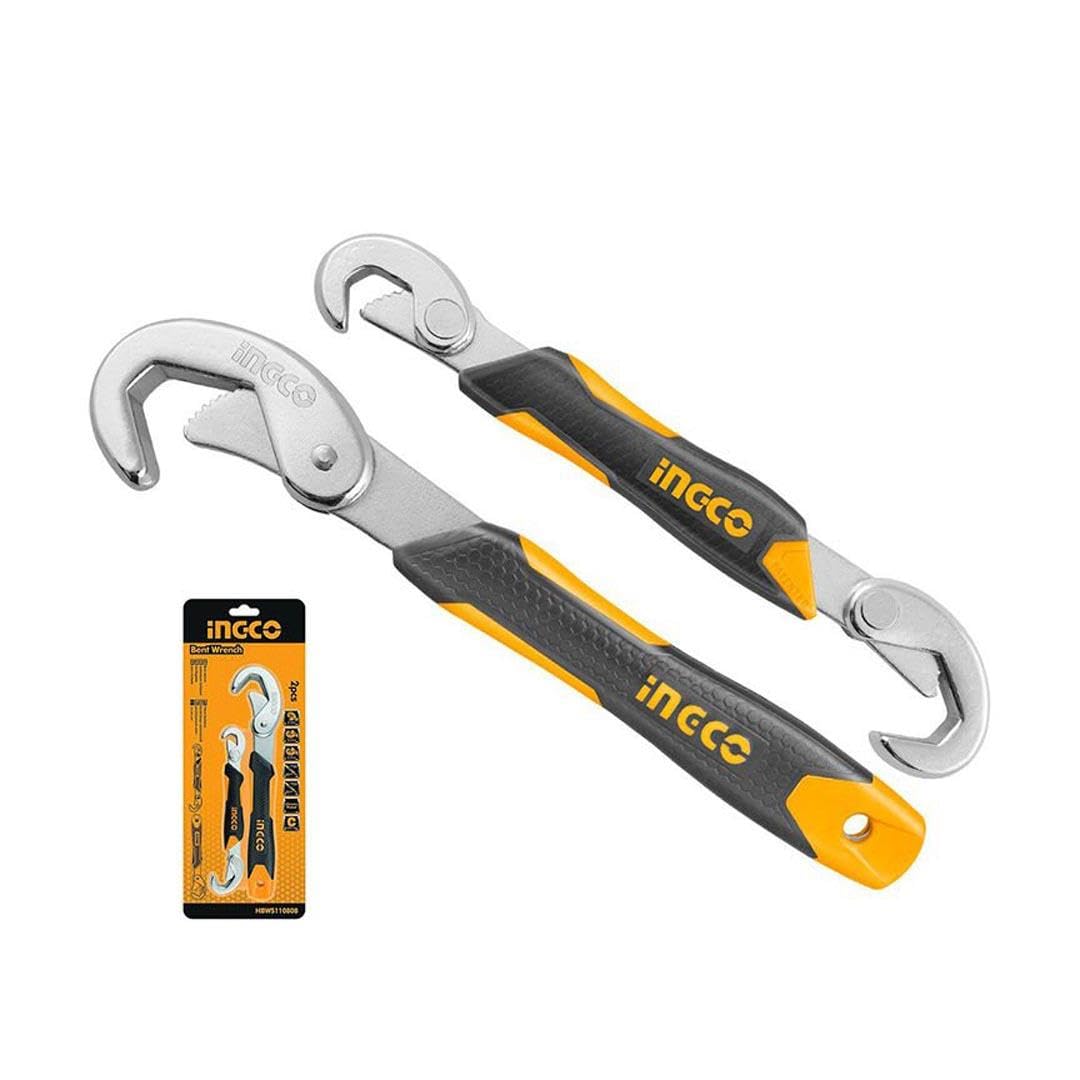 The Ingco Universal Wrench Set (Model HBWS110808) is an industrial-grade tool designed for versatility and efficiency. This set includes two wrenches: one covering a size range of 9-22mm and another for 23-32mm. Each wrench features chrome heads with precisely dimensioned openings on the inner part, engineered to provide significantly greater strength and minimize slippage during use. The handles are designed with a patented honeycomb grip pattern and integrated finger rests, ensuring superior torque application and reducing hand strain for comfortable operation. The curved head design allows the wrench to automatically adjust to the ideal size for convenient and quick application.