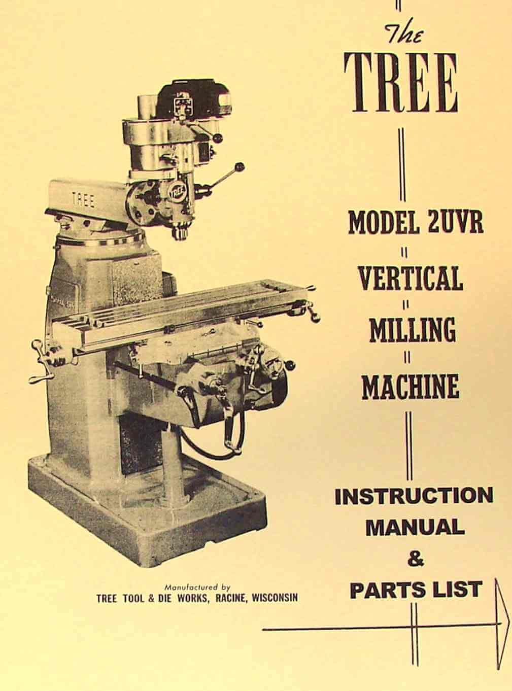 As this document is a reproduction of an original instruction and parts manual for an older machine, it does not contain current warranty information or direct manufacturer support contacts for the TREE 2UVR Vertical Milling Machine. For service or parts inquiries for existing machines, it is recommended to consult specialized vintage machinery suppliers or experienced machine repair technicians.