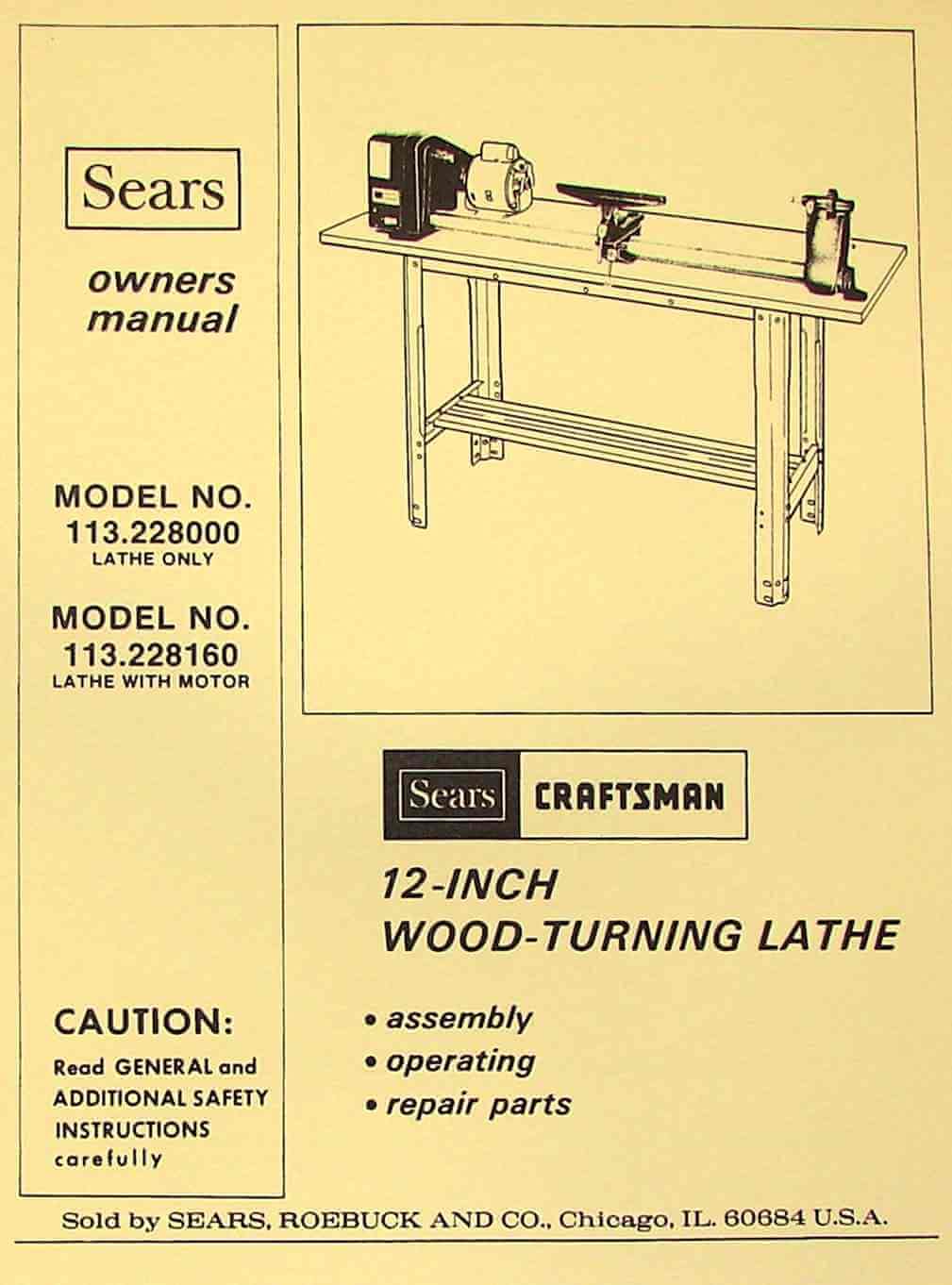 Image: Cover of the reproduced Craftsman 113.228000 and 113.228160 Wood Lathe Owner's and Parts Manual.