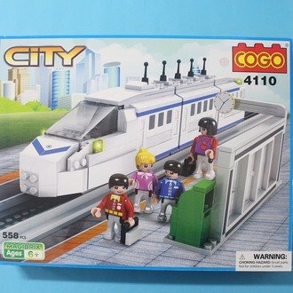 Image: The COGO City 4110 Building Block Set, featuring a white and blue bullet train, a station platform, and minifigures. This image illustrates the complete assembled model.