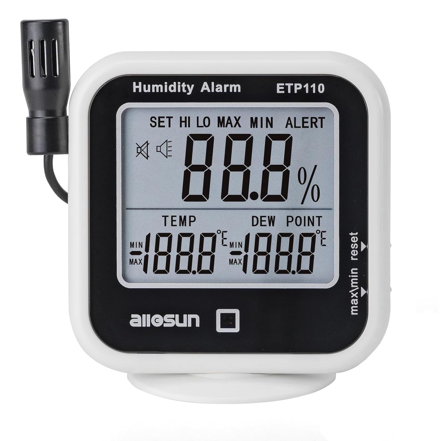 The ALLOSUN ETP110 is a multifunctional digital thermo-hygrometer designed for monitoring temperature, relative humidity, and dew point. This instrument is suitable for various environments including laboratories, workshops, warehouses, greenhouses, and residential settings. It features a large LCD display for clear readings and includes a humidity alarm function.