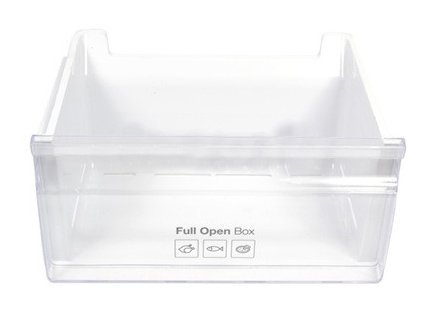 Figure 2.1: Samssung RB31FERNBSS Freezer Drawer. This image shows the clear plastic drawer with "Full Open Box" text and three small icons (fish, fish, ice cube) printed on its front surface, indicating its purpose for food storage.