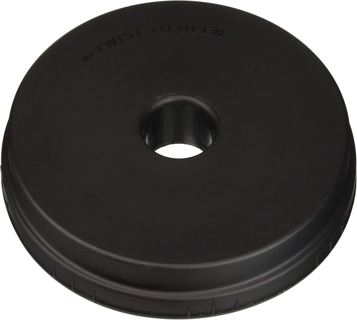 Figure 1: ProTeam 100320 Upper Twist Cap. This image shows the black circular cap with an arrow and the text "TWIST TO OPEN" molded into its surface, indicating the direction for opening. The center features a circular opening.