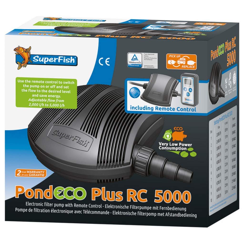 The Superfish Pond Eco Plus Rc 5000 features a remote control for adjusting water flow.