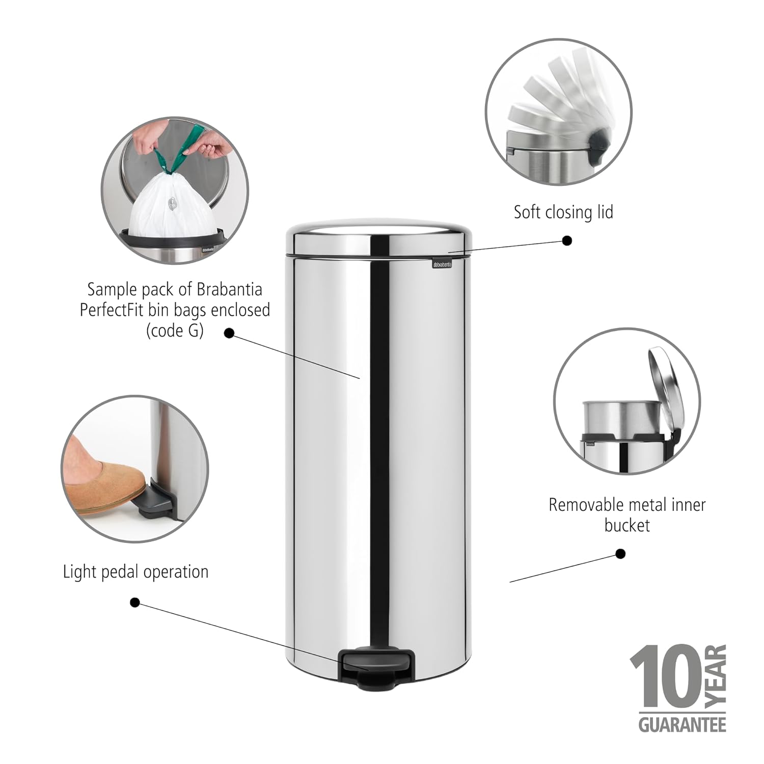 The Brabantia newIcon Pedal Bin 114762 comes with a 10-year Brabantia guarantee. This guarantee covers defects in materials and workmanship under normal household use. For full terms and conditions, please refer to the official Brabantia website or contact customer support.