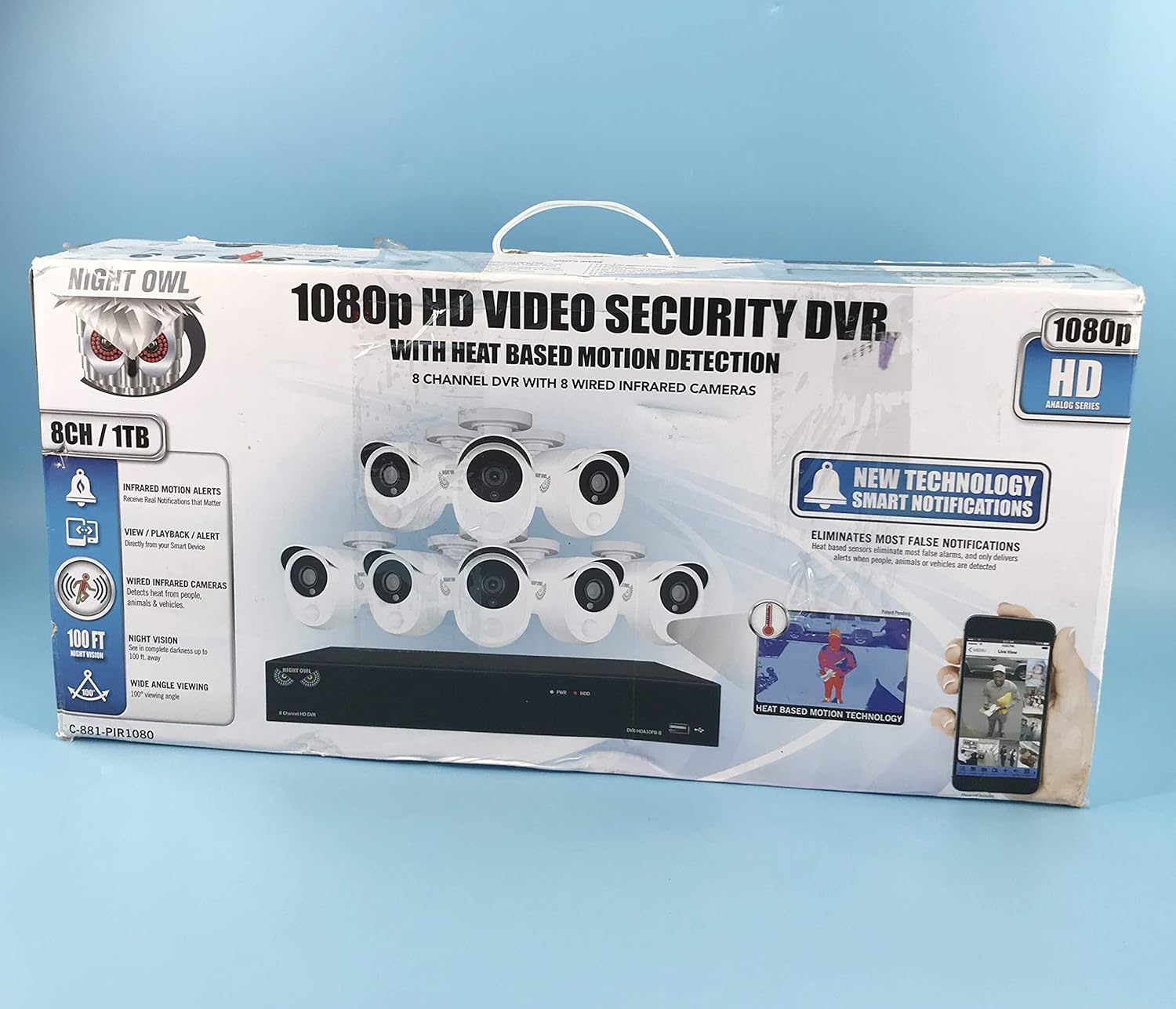 Image: The retail packaging for the Night Owl 8-Channel HD DVR Security System, showcasing the DVR and eight 1080p cameras.
