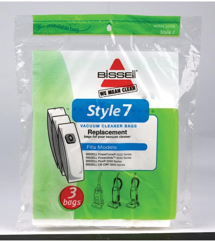 Image: Packaging for Bissell Style 7 Vacuum Cleaner Bags, highlighting compatibility with various Bissell models such as PowerForce 3522 Series, PowerGlide 3545 Series, Plus 3550 Series, and Lift-Off 3554 Series.
