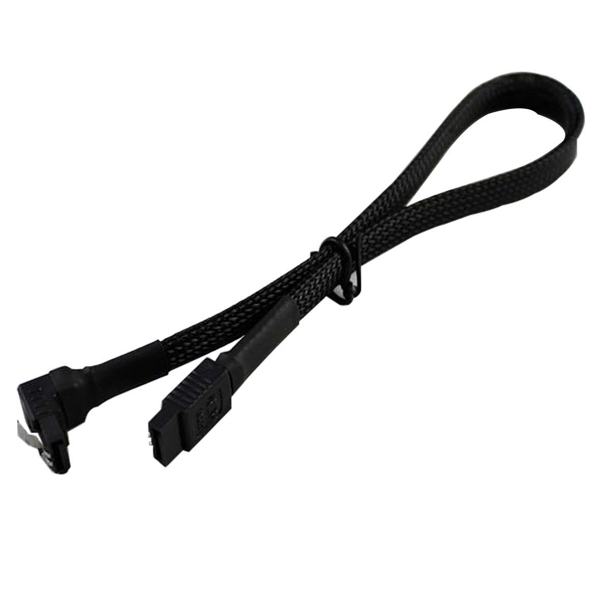 An image showing the Darkside 30cm SATA 3.0 data cable. One end features a straight 180-degree connector, while the other end has a right-angle 90-degree connector, both equipped with securing latches. The cable itself is black and sleeved.