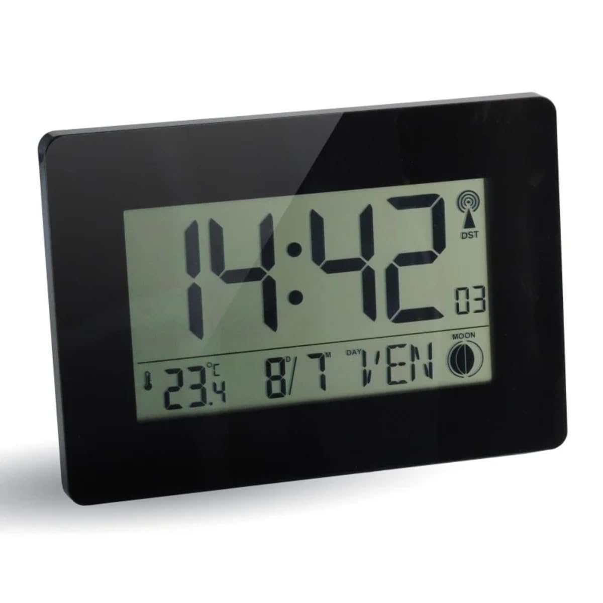 Image: The Orium 11094 Digital RC Austin clock, black plastic, showing the time 14:42, positioned on a white shelf next to decorative items in a contemporary room.