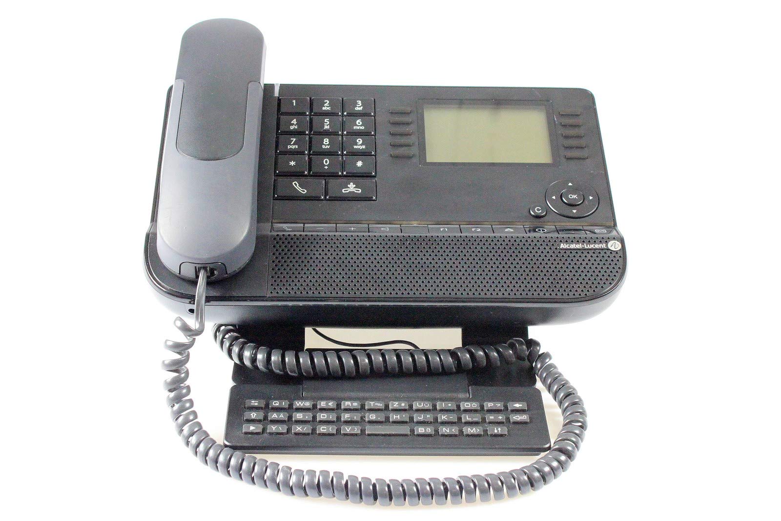 The Alcatel-Lucent 8039 Deskphone includes the main unit, handset, and an alphanumeric keyboard. It features a backlit display and various function keys for operation.