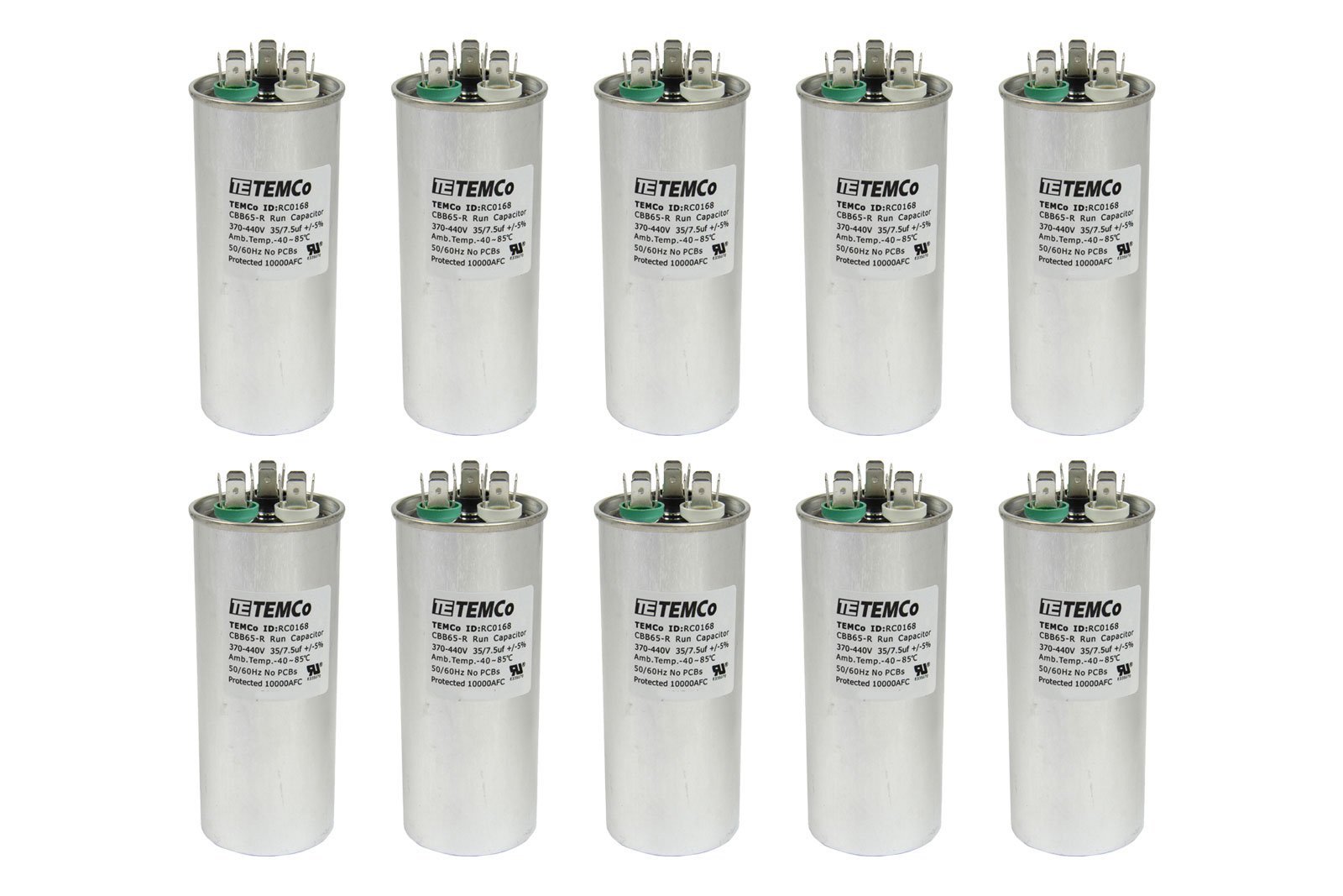 Image: Main view of the TEMCo 35+7.5 uF Dual Run Capacitor, showing its cylindrical aluminum casing and terminal layout.