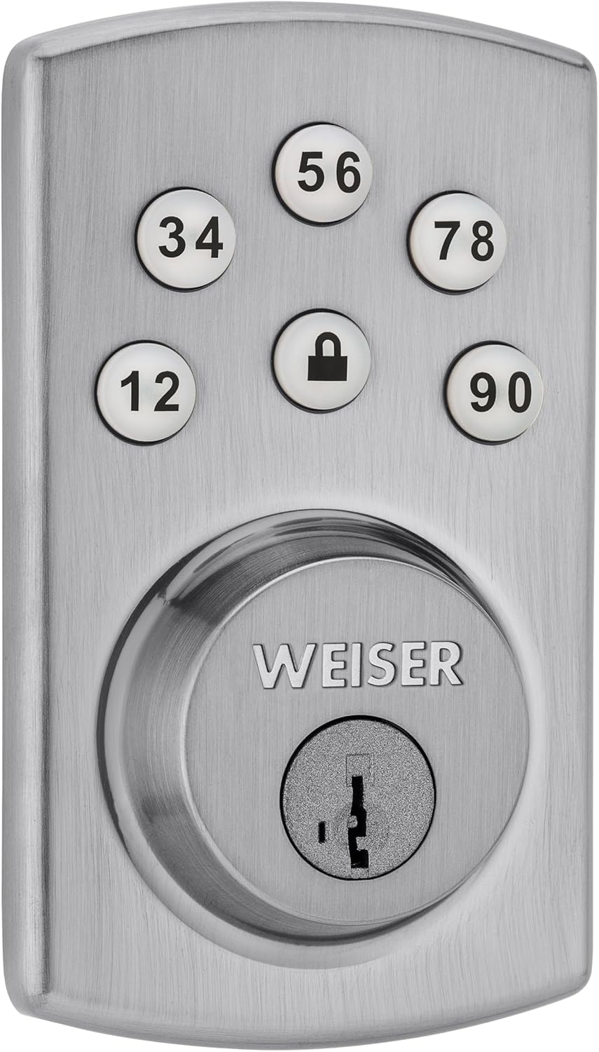 The Weiser Powerbolt 2 is a keyless entry deadbolt lock designed for convenient and secure access. It features a keypad for personalized access codes, motorized locking, and SmartKey re-key technology. This single cylinder deadbolt can be operated using the keypad or a traditional key from the outside, and a turn button from the inside. The Satin Chrome finish provides a modern aesthetic.