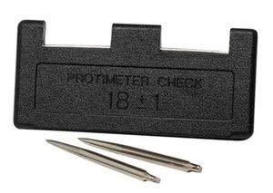 Image Description: A black rectangular Protimeter BLD5086 Calcheck device with "PROTIMETER CHECK 18 ± 1" embossed on its surface. Two metallic pin electrodes are shown separately below the device, indicating they are used with the device or are replacement parts.
