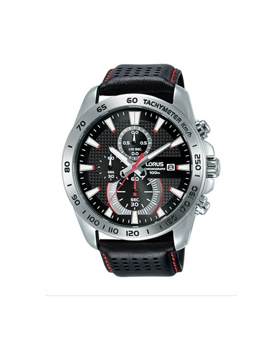 The Lorus RM393DX9 is a men's analog watch featuring a black dial, chronograph functions, and a black leather strap. It is designed for daily wear and offers water resistance up to 100 meters.