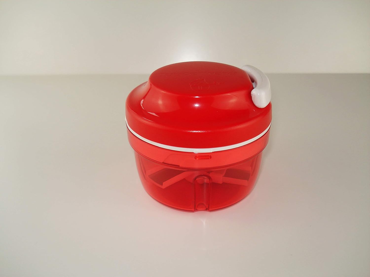 Image 2: The Tupperware Turbo Chef disassembled. From left to right: the red lid with pull handle, the transparent red container, and the triple-blade cutting assembly with its protective cover.