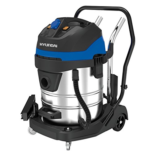 Figure 1: Overview of the HYUNDAI BJ141A-2400-60 Wet/Dry Vacuum Cleaner and its main components. The image shows the stainless steel tank, motor head, hose, and various attachments.