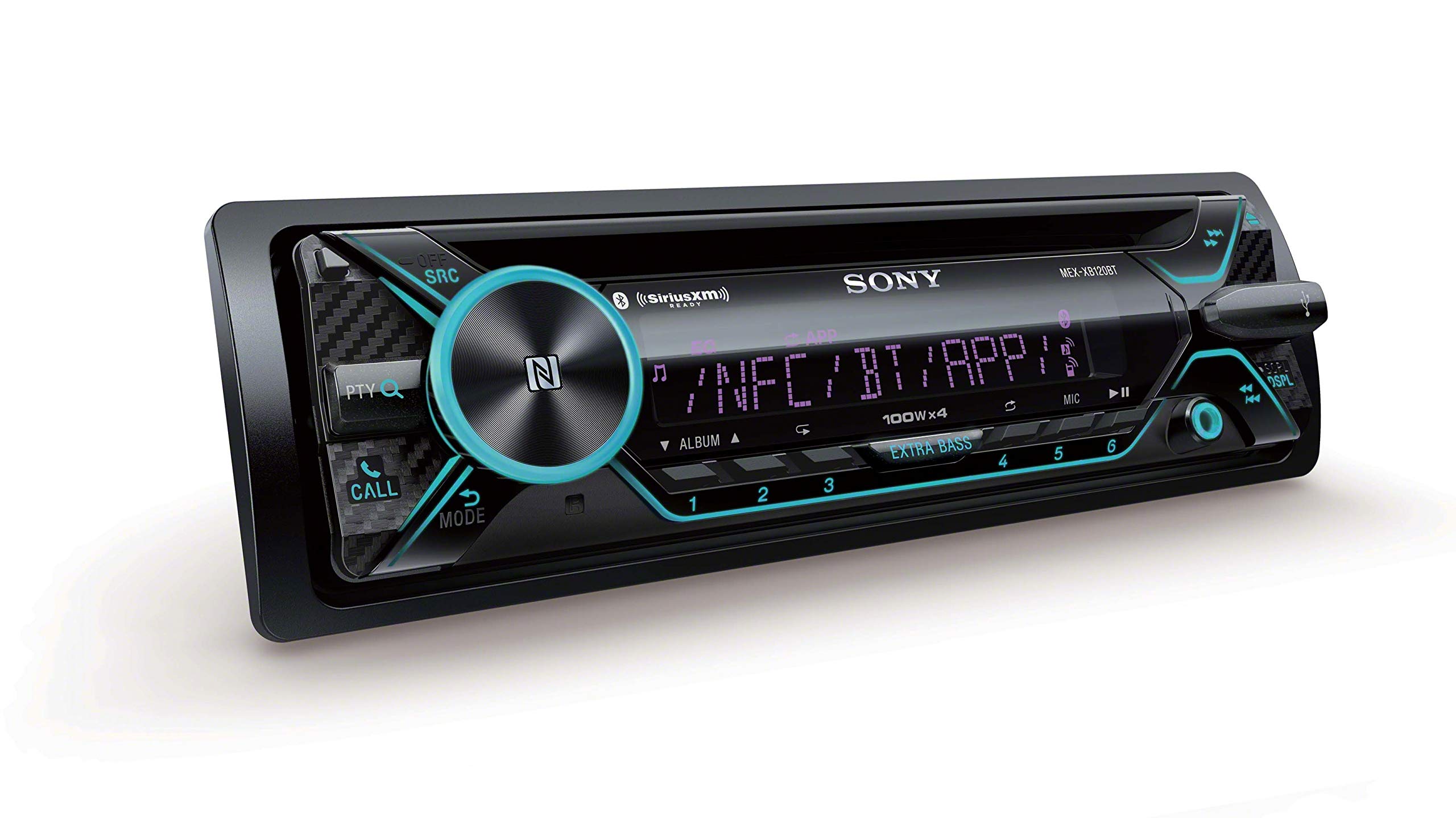 Figure 1: Front panel view of the Sony MEX-XB120BT car stereo. This image displays the main unit with its display, control knob, and various buttons for source selection, call functions, and extra bass.