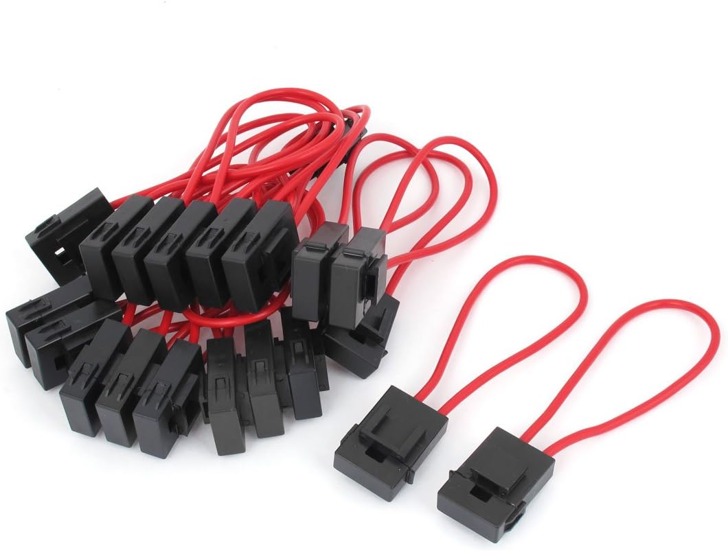 This image displays the complete set of 20 Aexit in-line fuse holders, each featuring a black plastic housing and red insulated wires. The holders are designed to protect automotive electrical circuits by housing an ATC fuse.