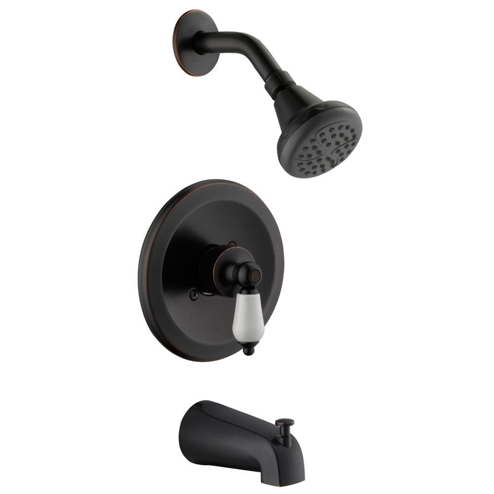 Image 1: The Glacier Bay HD873X-8627D single-handle tub and shower faucet in bronze finish. This image shows the complete faucet assembly, including the handle, tub spout, and showerhead, ready for installation.