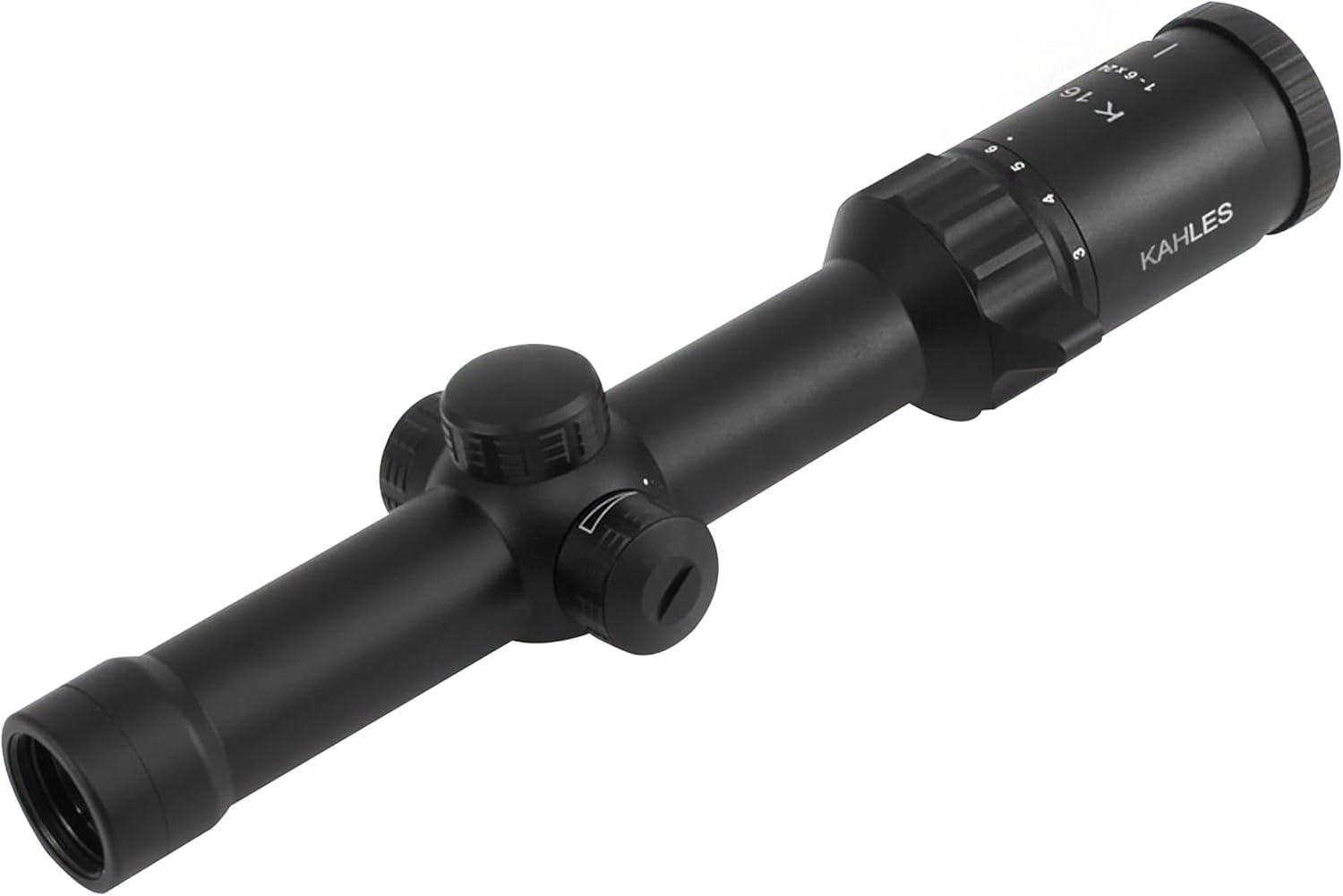 The KAHLES K16i Riflescope is designed for precision and durability, offering exceptional optical clarity and a wide field of view. It features a 1-6x magnification range and a 24mm objective lens, making it suitable for various shooting applications.