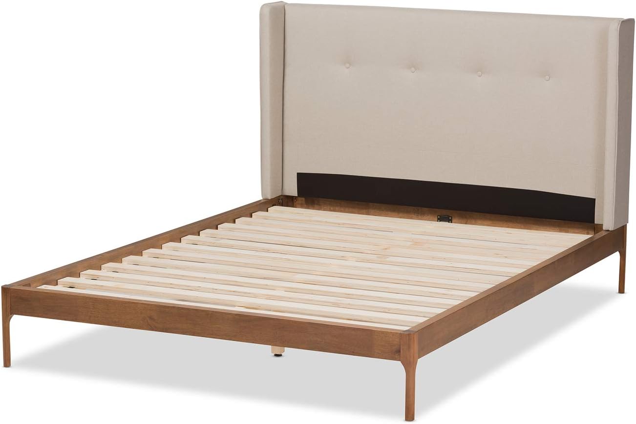 The Baxton Studio Brooklyn King Size Platform Bed features a durable rubber wood frame with walnut finishing and a polyester fabric upholstered headboard with button-tufting and edge piping, designed for a timeless mid-century modern aesthetic.