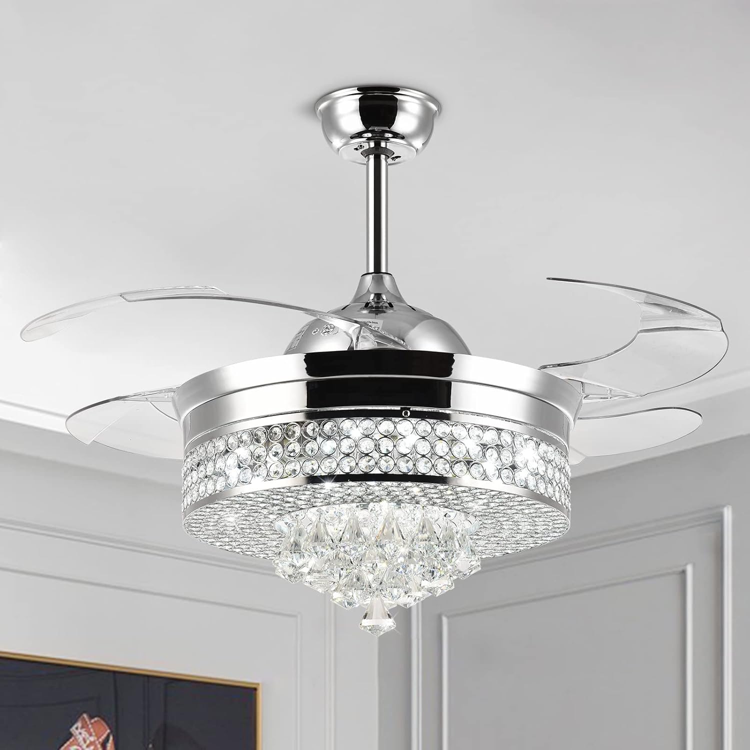 Figure 1.1: The NOXARTE 42 Inch Crystal Chandelier Fan, showcasing its elegant design and retractable blades.