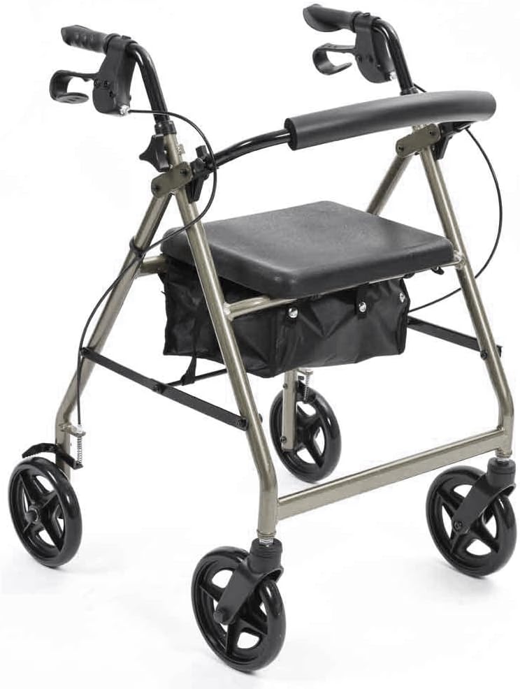 - Before sitting, ensure the parking brakes are fully engaged to prevent the rollator from moving.