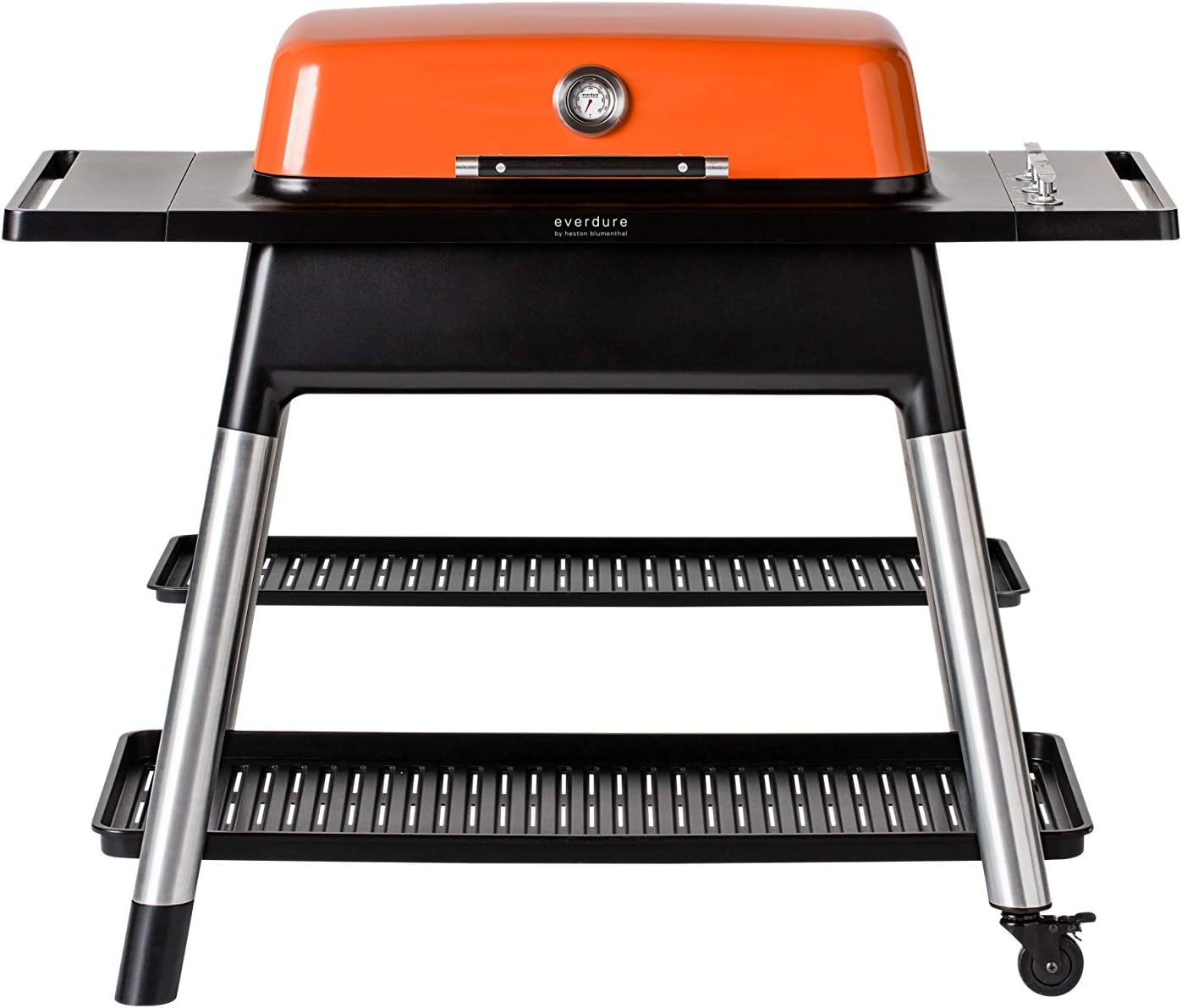 This image displays the complete Everdure Furnace 3-Burner Gas Grill, showcasing its sleek orange hood, black body, and sturdy stand with two lower storage shelves. The grill features a built-in temperature gauge on the hood and control knobs on the side panel.