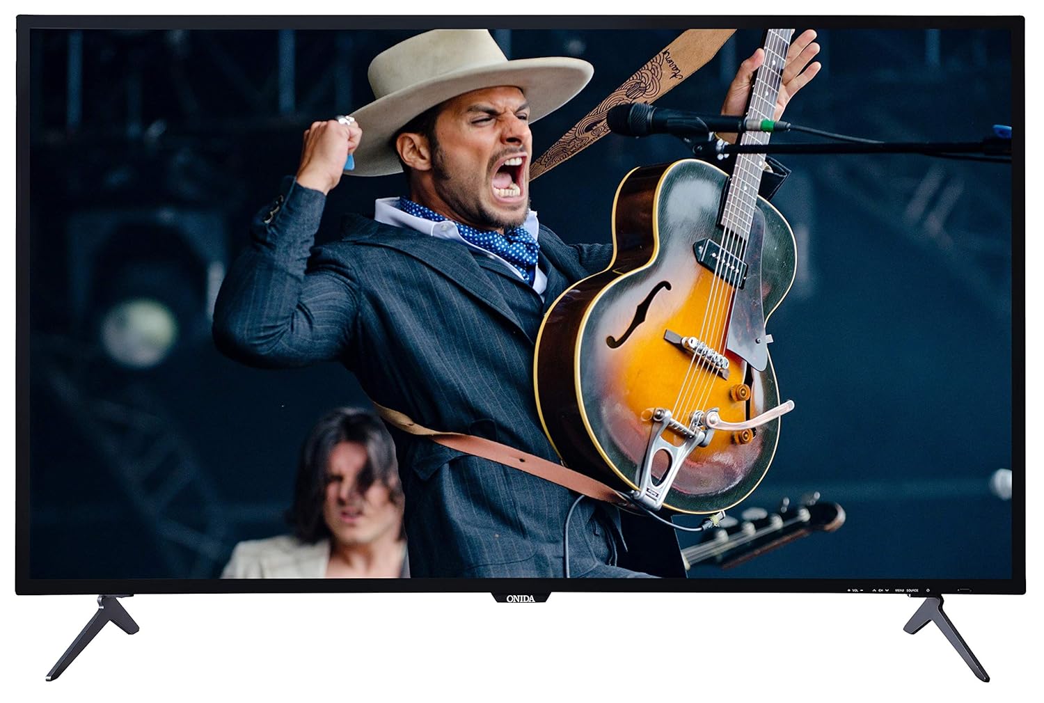 This image displays the front of the Onida 50UIR television, showcasing its slim bezels and the included table-top stands. The screen shows a vibrant image of a musician.