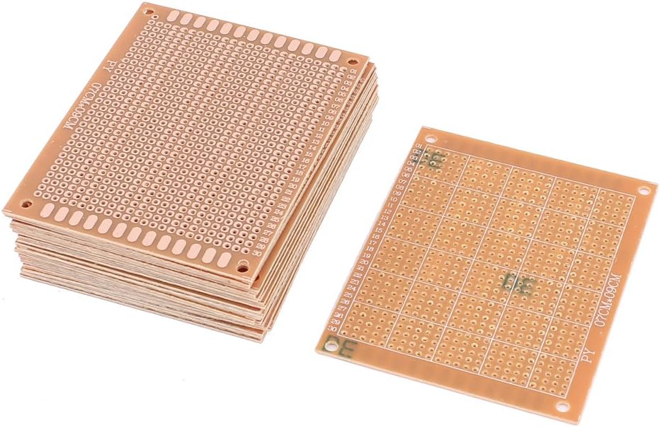 The Aexit Universal PCB Boards are single-sided circuit boards featuring a grid of pre-drilled holes, ideal for hobbyists, students, and professionals to construct custom electronic circuits. Each board includes referencing numbers printed along the edges for easy identification of individual holes, facilitating precise component placement.