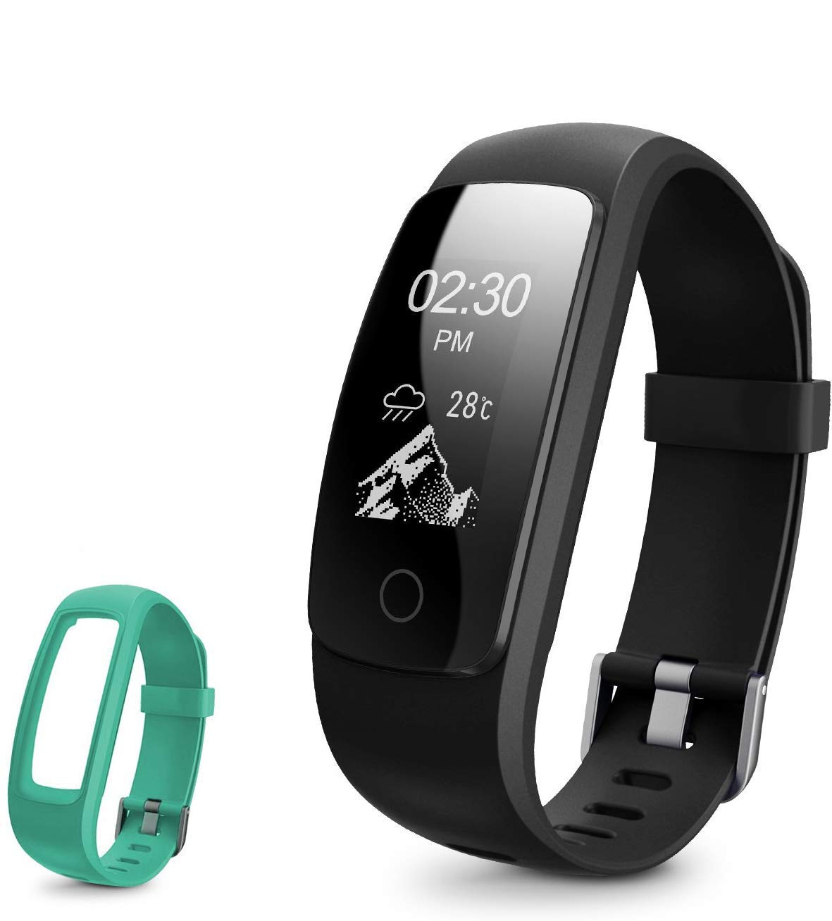 Image: The DBPOWER Fitness Tracker, featuring a black band and an additional green band, showcasing its sleek design and color options.