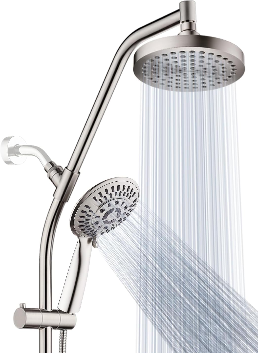 The system features a two-way diverter valve located on the shower column, allowing you to switch between the rain shower head, the handheld shower head, or use both simultaneously.