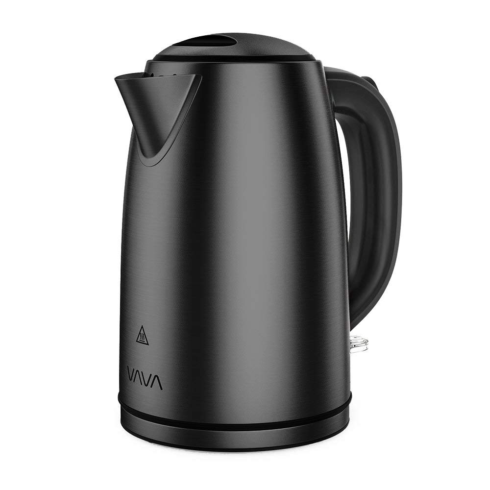 This image shows the VAVA 1.7L Stainless Steel Electric Kettle. It features a sleek stainless steel body, a handle, a spout, a lid, and a power base. The kettle is designed for efficient water boiling.