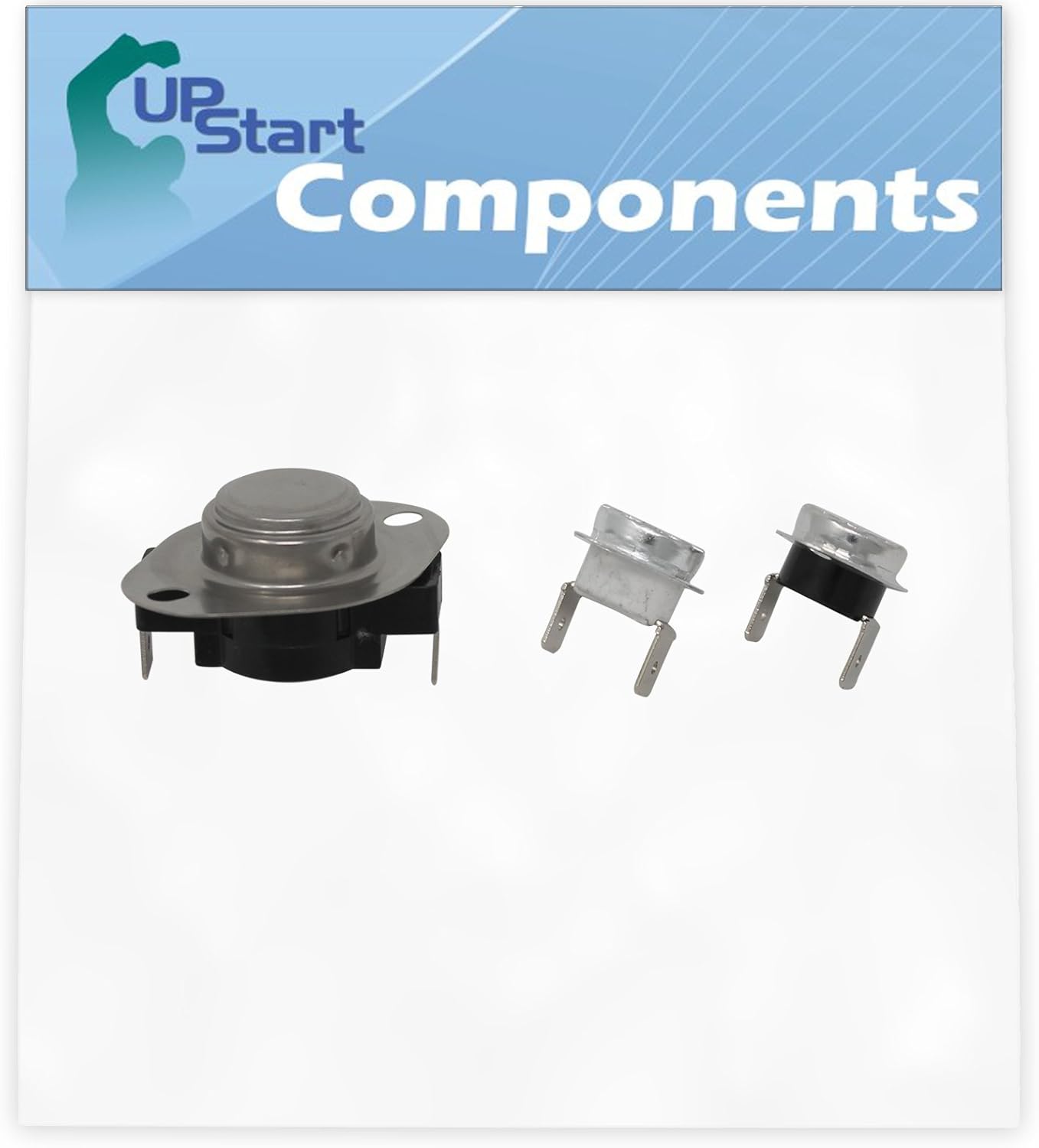 Image: Overview of the UpStart Components LA-1053 Thermostat Kit components. This image displays the three main parts included in the kit: a high-limit thermostat, a thermal cut-off fuse, and a cycling thermostat.