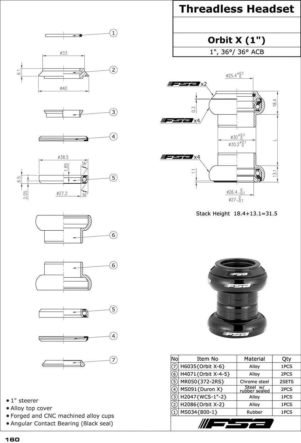 Image Description: This image displays an exploded view of the FSA Orbit X headset, showing all individual components such as the top cap, compression ring, upper bearing, upper cup, lower bearing, lower cup, and crown race. A technical drawing with dimensions and stack height details is also included, illustrating the precise measurements and assembly order.