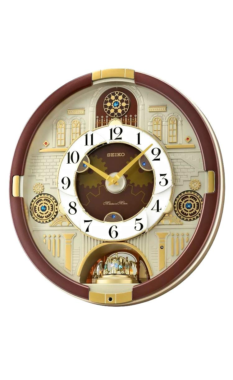 The Seiko Melodies in Motion Clock QXM377BR is an elegant wall clock designed to enhance any living space. This musical clock features intricate motion, playing one of 30 Hi-Fi melodies every hour on the hour. Adorned with 10 Swarovski crystals, it offers a captivating visual and auditory experience. A built-in light sensor automatically disengages music and light in dark conditions, ensuring quiet operation during nighttime hours.