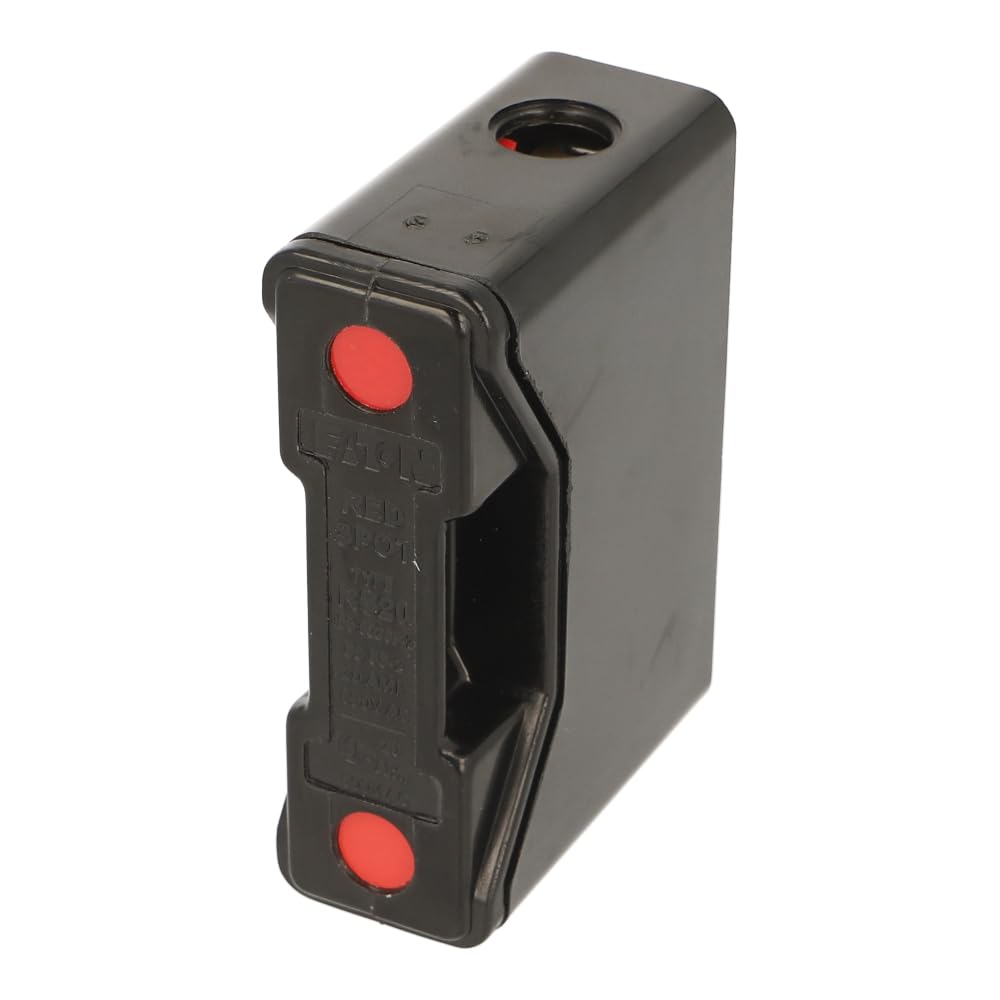 The Bussmann RS20HFTG is a front-connected fuse holder designed for industrial and commercial applications. It is rated for 20 Amps and 690 Volts. The "RED SPOT" feature provides a visual indication of a blown fuse, enhancing safety and simplifying troubleshooting.