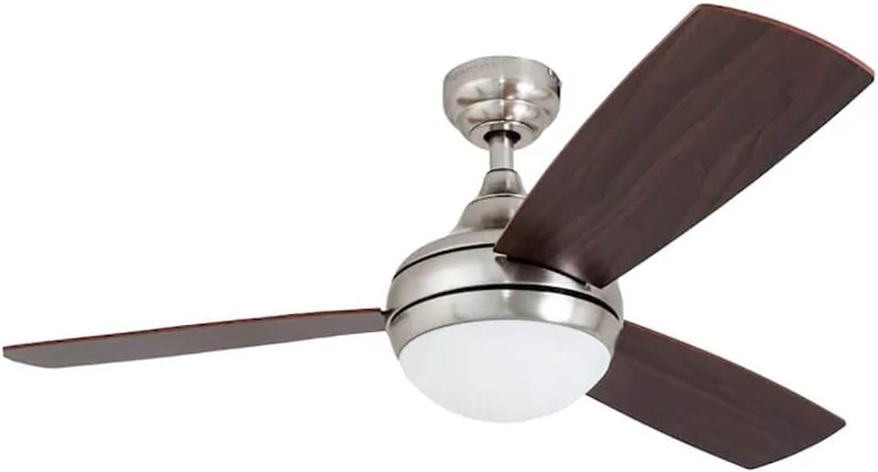 - Indoor 44-inch Design: Features a brushed nickel finish with three reversible blades (nutmeg and natural finishes).