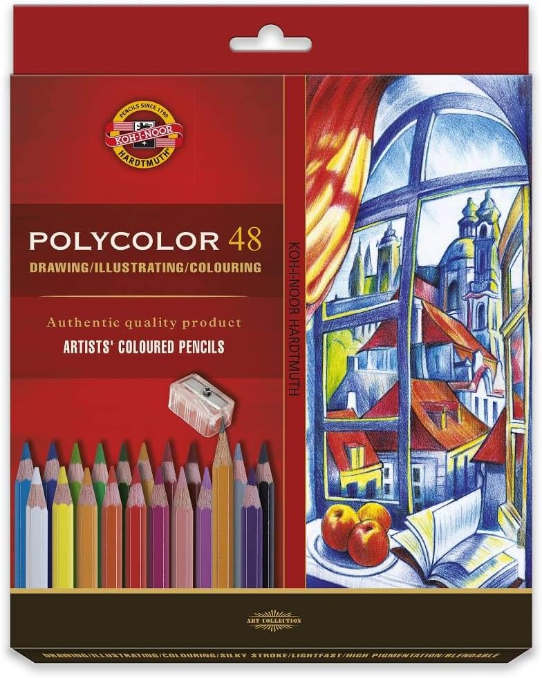 KOH-I-NOOR Polycolor pencils are designed for versatility in drawing, illustrating, and coloring. Their high-quality leads offer a silky stroke, lightfastness, high pigmentation, and excellent blendability.
