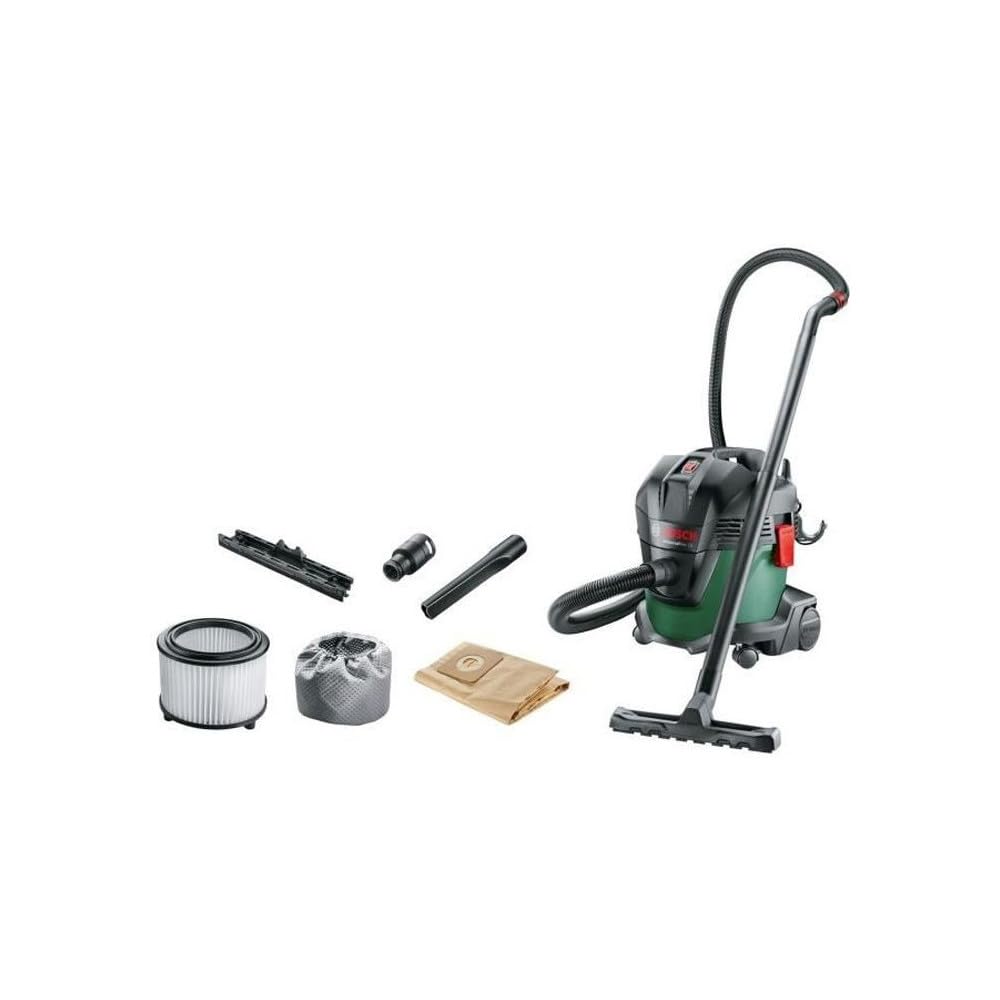 Image: The Bosch UniversalVac 15 vacuum cleaner shown with its various accessories, including the hose, extension pipes, floor nozzle, crevice nozzle, filters, and paper bag.