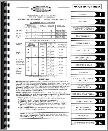 The manual is organized into major sections to facilitate easy navigation and part identification. Each section covers a specific system or component group of the Hough D-90C Pay Dozer.
