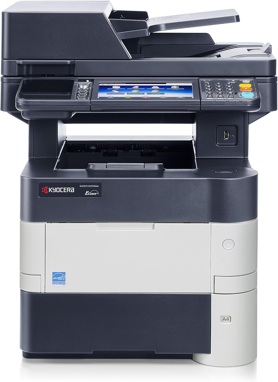 The Kyocera ECOSYS M3550idn is a versatile black and white multifunctional printer designed for corporate workgroups. It integrates printing, copying, color scanning, and fax functionalities into a single device, offering efficient document management. This model is equipped with a responsive 7-inch color touch screen for intuitive operation and supports various connectivity options.