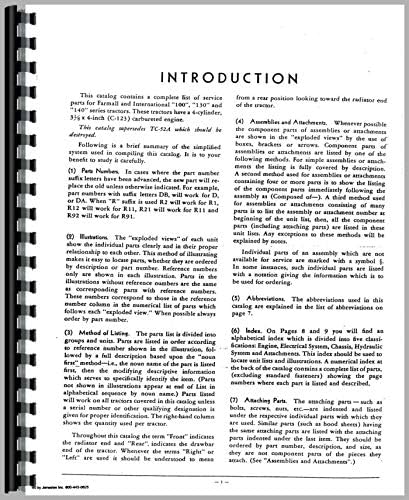 This manual, designated TC-52B, serves as a comprehensive parts catalog for Farmall and International 100, 130, and 140 series tractors manufactured between 1958 and 1979. It is designed to assist in identifying and ordering replacement parts for these models, including those equipped with a 3-inch x 4-inch (C-123) carbureted engine.