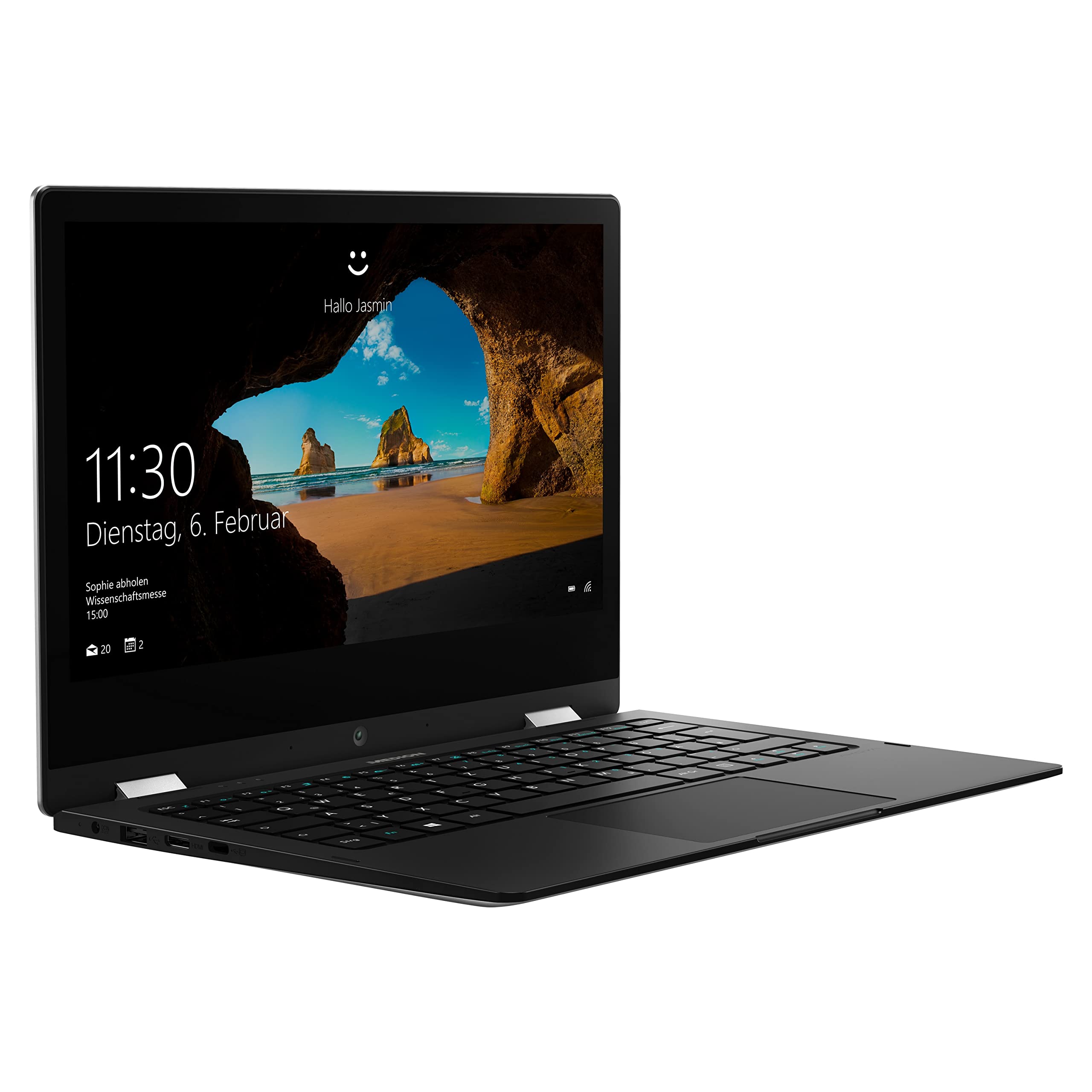 Image: The MEDION E3221 laptop demonstrating its 360-degree hinge and multiple usage modes.