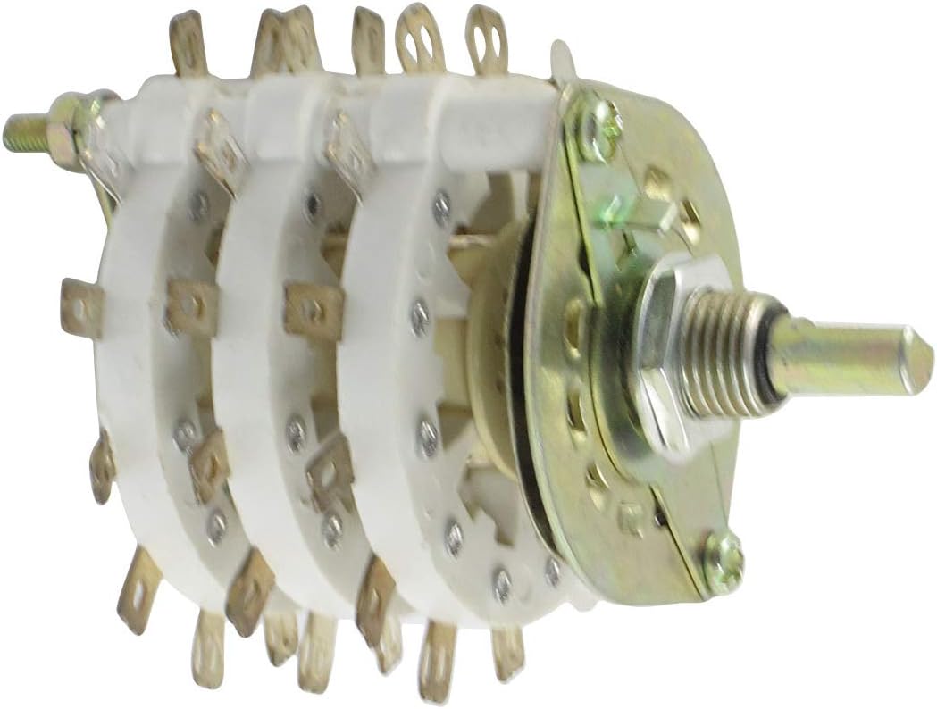 Image: The Aexit Rotary Selector Wall Switch, featuring its multi-deck construction. The image clearly displays the three white insulating decks, each with multiple brass terminals arranged in a circle. On the right, the metal mounting plate and the threaded shaft for attaching a control knob are visible. The overall design indicates a robust component for electrical circuit selection.