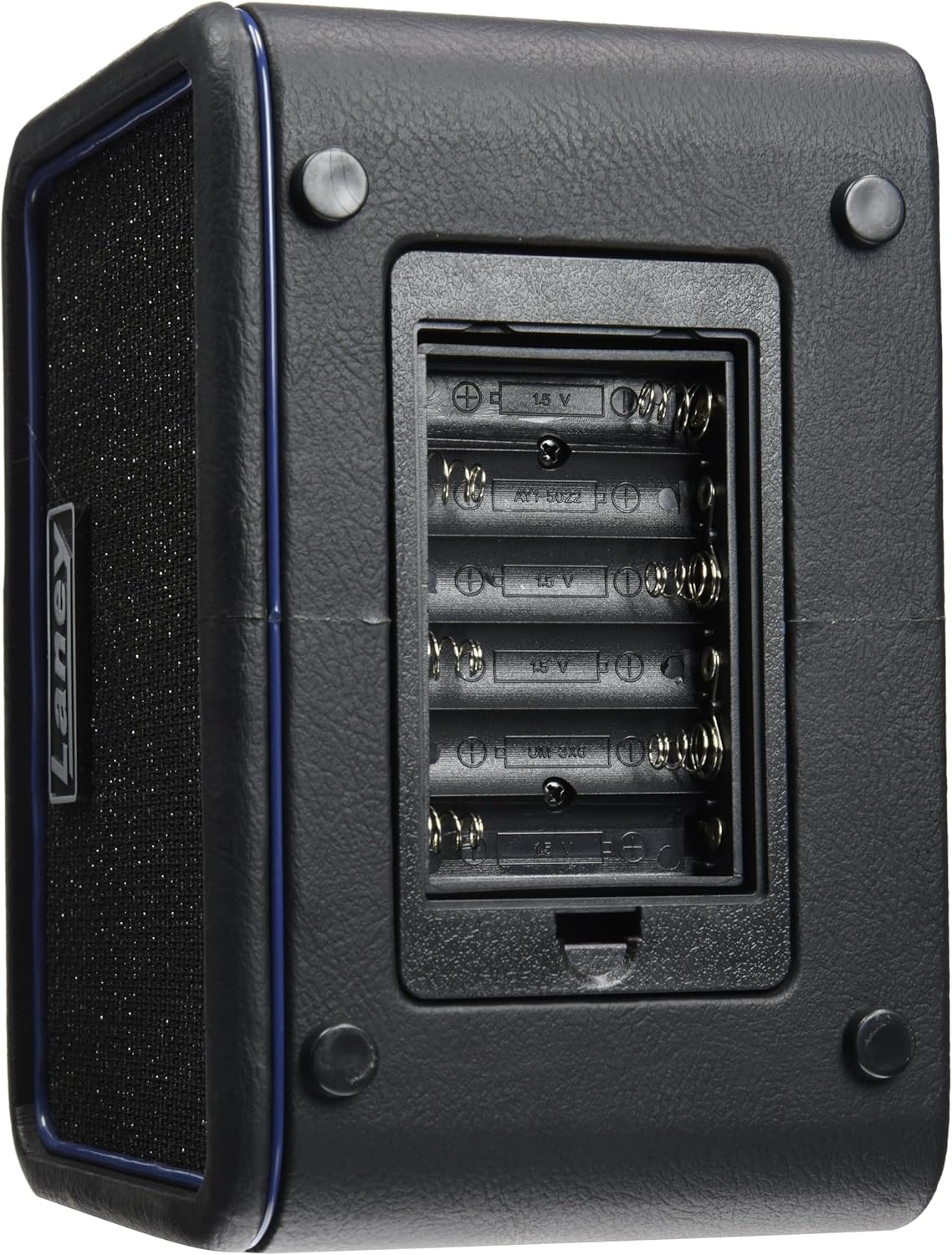 Image: Rear view of the Laney MINI-BASS-NX amplifier with the battery compartment open, showing slots for six AA batteries.