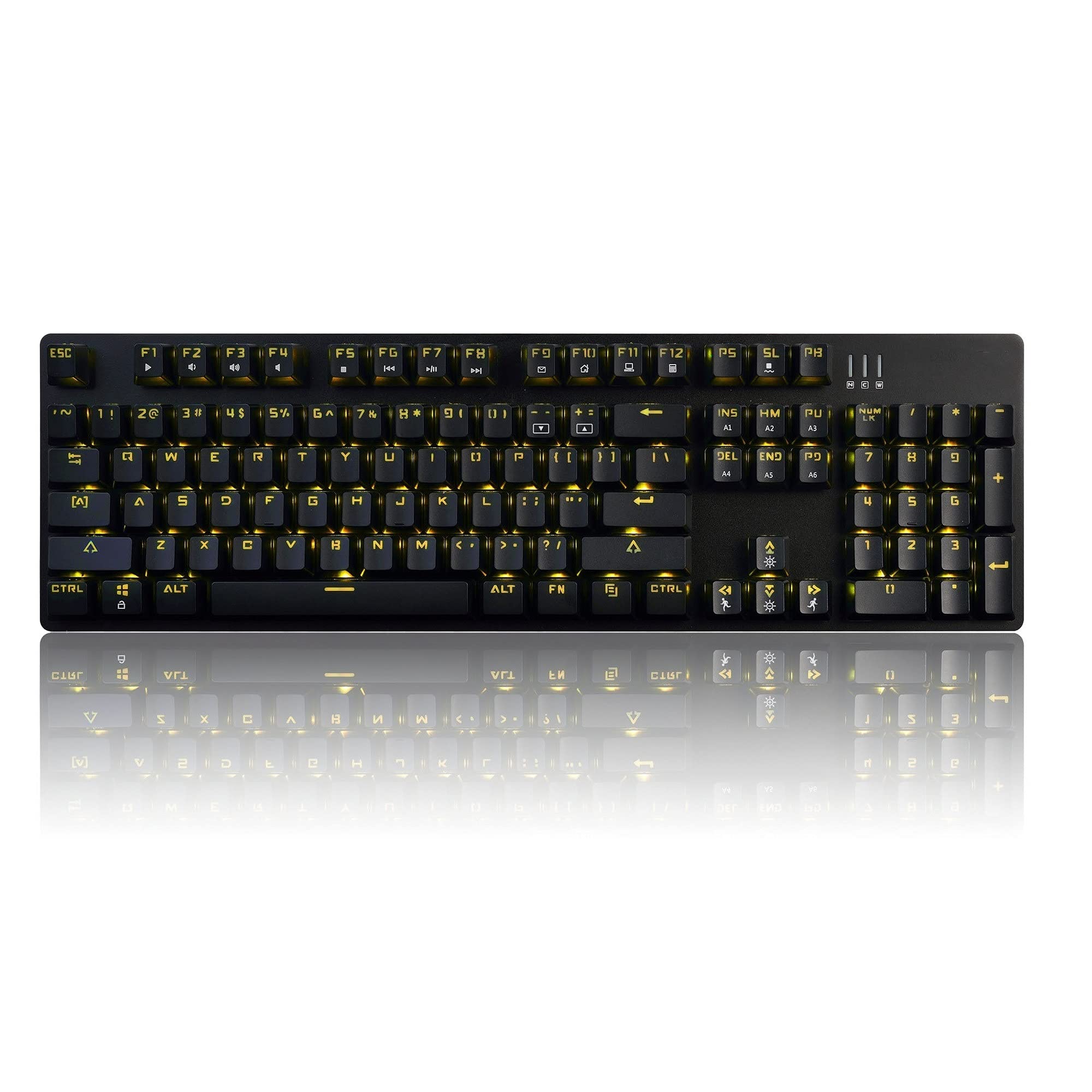 The keyboard features yellow LED backlighting with multiple modes and customization options.